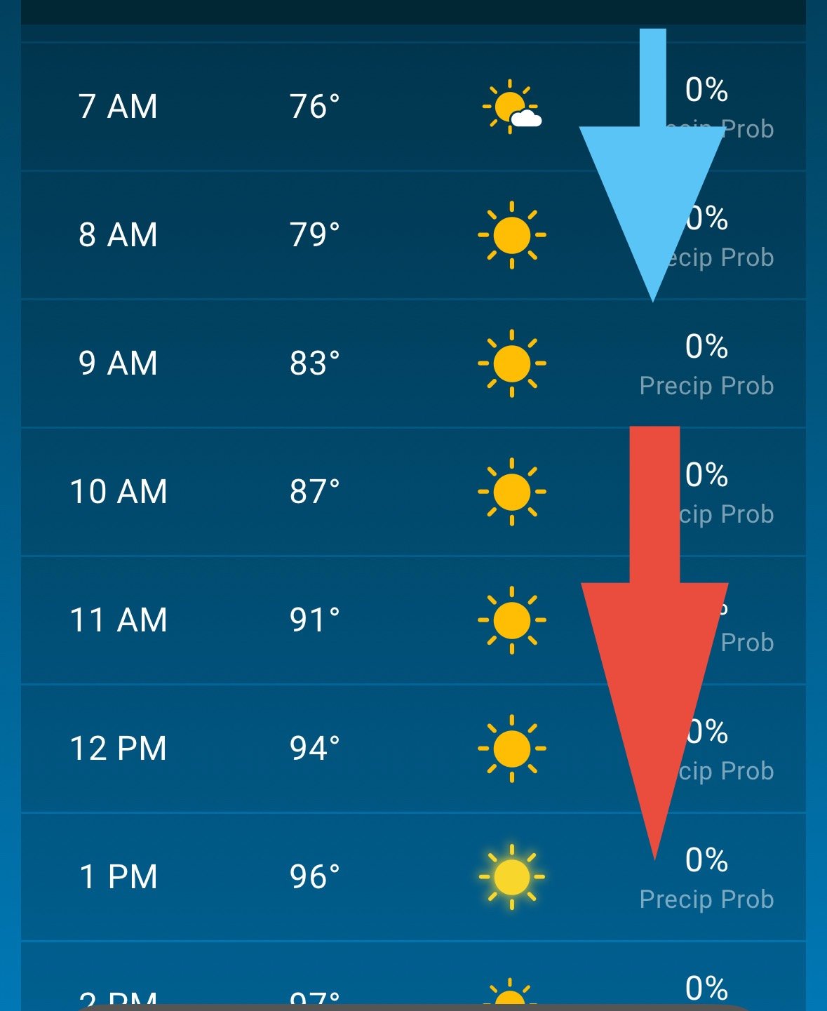 Noon is rarely the hottest part of the day. It’s typically between 1 and 4. That’s because the sun heats up the ground all morning, then that heat radiates back up off the ground.